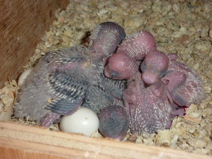 A photo of "Precious" with her fella. January 11, 2012:- fifth egg did'nt hatch , but four chicks doing well , youngest looks like a pied.